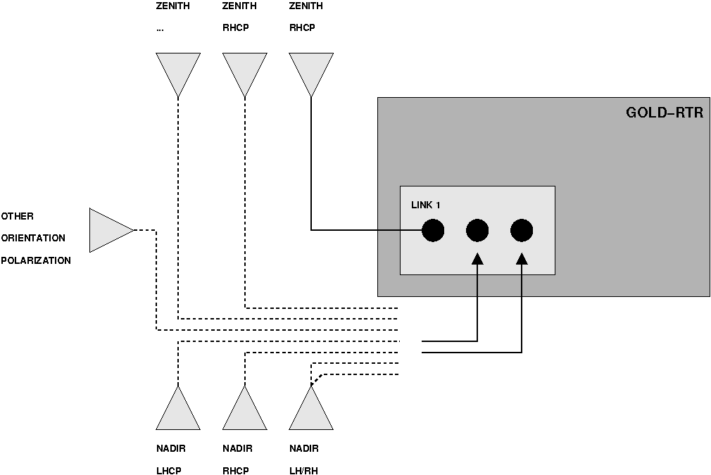![]() Figure 1: The so-called Link-1 of the GOLD-RTR must connect the first radio front-end to an up-looking RHCP antenna for navigation. The signal of this antenna feeds an internal Novatel commercial navigation card installed inside the GOLD-RTR, used for navigation and to provide timing and the geometric parameters required to compute the delay-models of the open-loop correlation channels. The rest of radio front-ends (two more in the original GOLD-RTR and up to 7 more in GOLD-RTR II) can be feed by any other antenna (pointing down/up or towards other directions), working at any polarization (RH/LH, vertical, horizontal...). The functionality of the GOLD-RTR, goes therefore beyond GNSS-R measurements, but other applications could be performed (radio-occultation from horizon-looking antennas, attitude control from a set of up-looking antennas, etc). The correlation channels are programmed to work with signals from either link, with an updatability of every second. The GOLD-RTR campaign user must know which antenna/polarization is connected to each Link when programming the correlators. Data Citation
