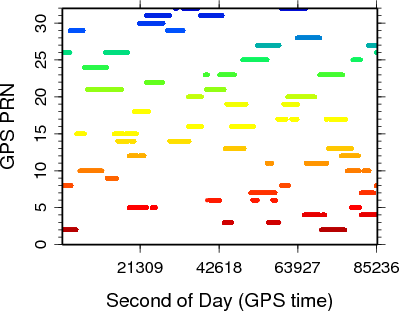 Example of time series and ground-track geo-location for November 21st 2008. The rest of days have similar patterns, shifted in time (~4 minutes shift every day).